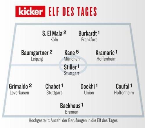 踢球者评选德甲第7轮最佳阵容:凯恩领衔,科隆天才马拉在列