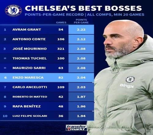 82战场均2.04分,马雷斯卡超越安帅升至切尔西队史主帅第6位