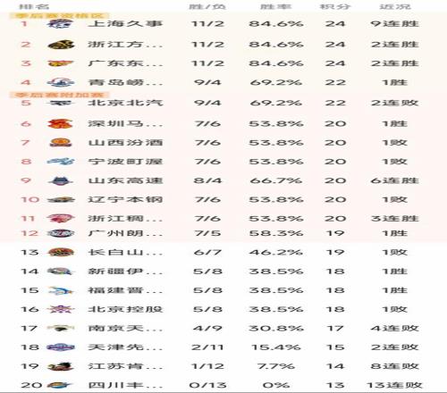 山东目前的战绩是8胜4负,他们只打了12场比赛,昨晚89-76战胜南京迎来一波6连胜,仅次于9连胜的上海。广州以7胜5负积19分暂列第12名,吉林6胜7负积19分暂列第13名。新疆、福建和北控都是5胜8负积18分暂列第14-第16名。南京遭遇4连败,4胜9负积17分,天津、江苏和四川排在后三名,其中四川遭遇13连败垫底!