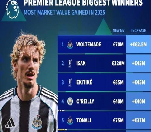 英超球员2025年身价涨幅榜:沃尔特马德暴涨6250万欧第1 -